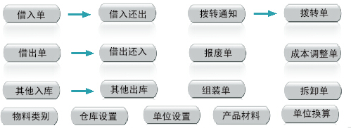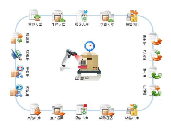 ●提供倉庫的主要日常管理所需的單據(jù),包括:借入、借出、其它出、其它入、盤盈、盤虧、報廢、組裝、拆卸、撥轉(zhuǎn)及成本調(diào)整功能。