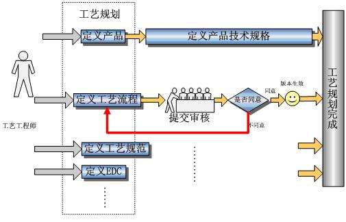 該模塊可擴展現行的MES系統產品定義能力.并且它與工程數據采集模塊相集成,以支持系統中工藝規范管理和工程數據采集的要求(見下圖).以下是工藝流程模塊的主要功能: