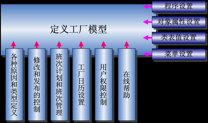 CIM 設置為新的MES系統提供設置功能.包括生產單位,用戶,權限設置,系統公共界面等. CIM模塊作為一個標準框架提供了大部分客戶所需的通用功能。提供了一系列的標準功能,有利于應用程序的迅速構建。使交叉多應用程序中對象的定義標準化。 支持多語種和多單位。因為許多定義被定義為數據,而不是在應用程序中Hard Code,系統變得更加靈活(見下圖)。以下是CIM設置的主要功能: