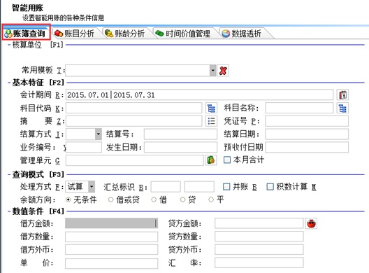 ①賬簿查詢,可按賬戶條件、時間條件、摘要條件、金額條件、業務條件、余額方向條件、是否并賬、預收付款賬期、是否積數計算、數據追溯等進行查詢,可將常用查詢保存為模板。