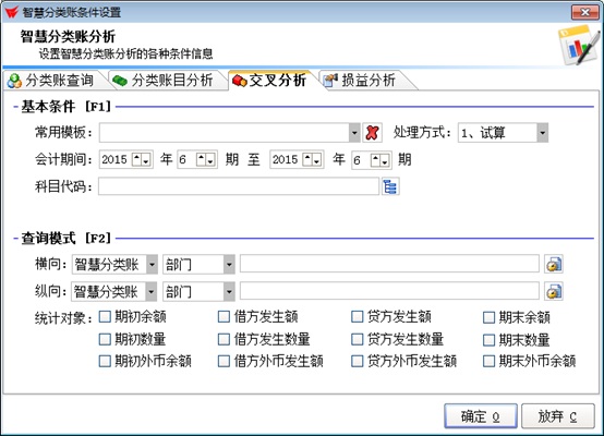 ②交叉分析:按照基本條件(會計期間、會計科目、處理方式、模版)、查詢模式(橫縱向查詢方式、統計對象查詢方式)進行組合對輔助核算項目交叉分析的方法。可對交叉析賬表進行輸出文件、輸出項顯示設置、保存模版等功能。