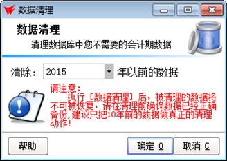 清除數據庫中不需要的會計期數據,在“數據清理”窗口中選擇相應的年份如2015,單擊“確定”即可將該年度之前的數據清除(不含2015年的數據)。