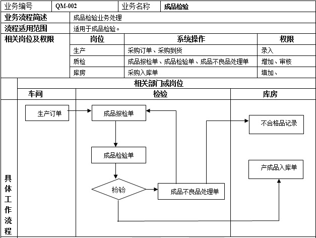 1、 車間在【物料需求計(jì)劃】中填制生產(chǎn)訂單推式生成成品報(bào)檢單。 2、 檢驗(yàn)崗位在【質(zhì)量管理】中由成品報(bào)檢單參照生成成品檢驗(yàn)單對(duì)存貨進(jìn)行檢驗(yàn)。 3、 庫房在【庫存管理】中由成品檢驗(yàn)單對(duì)合格品和降級(jí)品進(jìn)行入庫,參照生成產(chǎn)成品入庫單。 4、 檢驗(yàn)崗位在【質(zhì)量管理】中對(duì)不良品進(jìn)行處理,由成品檢驗(yàn)單參照生成不良品處理單。對(duì)于進(jìn)行抽檢檢驗(yàn)不合格存的貨進(jìn)行分揀,由不良品處理單參照生成成品報(bào)檢單。 |