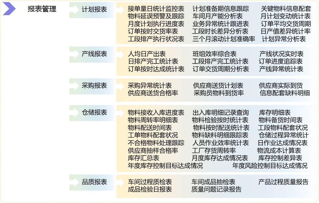 ⑤ 生產報表完善,《生產進度表》《產品進度明細表》《實際人員.時間.報工表》等生產分析類報表,為決策者提供強大助力;