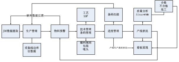 本系統實現功能主要為從JDE系統里接收任務單,記錄工單數據及各工段物料明細。系統監控并記錄產線活動情況,包括質量狀況、進度狀況。質量通過與Ainuo系統數據進行對接,同時在掃描過程當中記錄質量狀態,并在看板上展現。在產線上通過條碼系統采集數據,實現進度管理,并展現在看板上。在缺料情況下系統自動提醒,并展現在看板上。同時系統做到設備管理,在設備出現問題第一時間反饋錄入到軟件中,做到維修管理系統化。