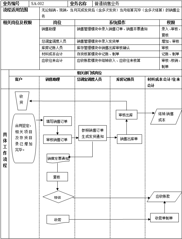 1、 銷售業(yè)務(wù)員與客戶簽訂銷售合同,銷售助理依據(jù)簽審?fù)戤叺?/span>銷售合同審批單在【銷售管理】模塊錄入銷售訂單并審核。 2、 產(chǎn)品生產(chǎn)完畢完工入庫(kù)后,總調(diào)室調(diào)度人員在【銷售管理】模塊根據(jù)銷售訂單生成銷售發(fā)貨通知單;3、 銷售助理根據(jù)客戶開票需求,查詢銷售發(fā)貨通知單審核狀態(tài),對(duì)已審核的銷售發(fā)貨通知單在【銷售管理】模塊中根據(jù)銷售發(fā)貨通知單生成銷售開票通知單,進(jìn)行復(fù)核處理; 4、 財(cái)務(wù)往來(lái)會(huì)計(jì)根據(jù)銷售助理復(fù)核后的銷售開票通知單,手工開具銷售專用發(fā)票、銷售普通發(fā)票,并在【應(yīng)收賬款】模塊中對(duì)銷售開票通知單進(jìn)行審核處理,形成應(yīng)收賬款往來(lái); 5、 【銷售管理】模塊中審核后的銷售發(fā)貨單通知單自動(dòng)傳遞到【庫(kù)存管理】模塊生成銷售出庫(kù)單。實(shí)物出庫(kù)后,庫(kù)房記賬人員根據(jù)將銷售出庫(kù)單一式三聯(lián),庫(kù)房保管人員、庫(kù)房留存、材料成本會(huì)計(jì))進(jìn)行打印留存,在【庫(kù)存管理】模塊對(duì)銷售出庫(kù)單進(jìn)行審核,材料成本會(huì)計(jì)在【存貨核算】模塊對(duì)銷售出庫(kù)單進(jìn)行單據(jù)記賬,系統(tǒng)自動(dòng)結(jié)轉(zhuǎn)銷售出庫(kù)成本,材料成本會(huì)計(jì)進(jìn)行制單生成銷售成本結(jié)轉(zhuǎn)憑證。 |
