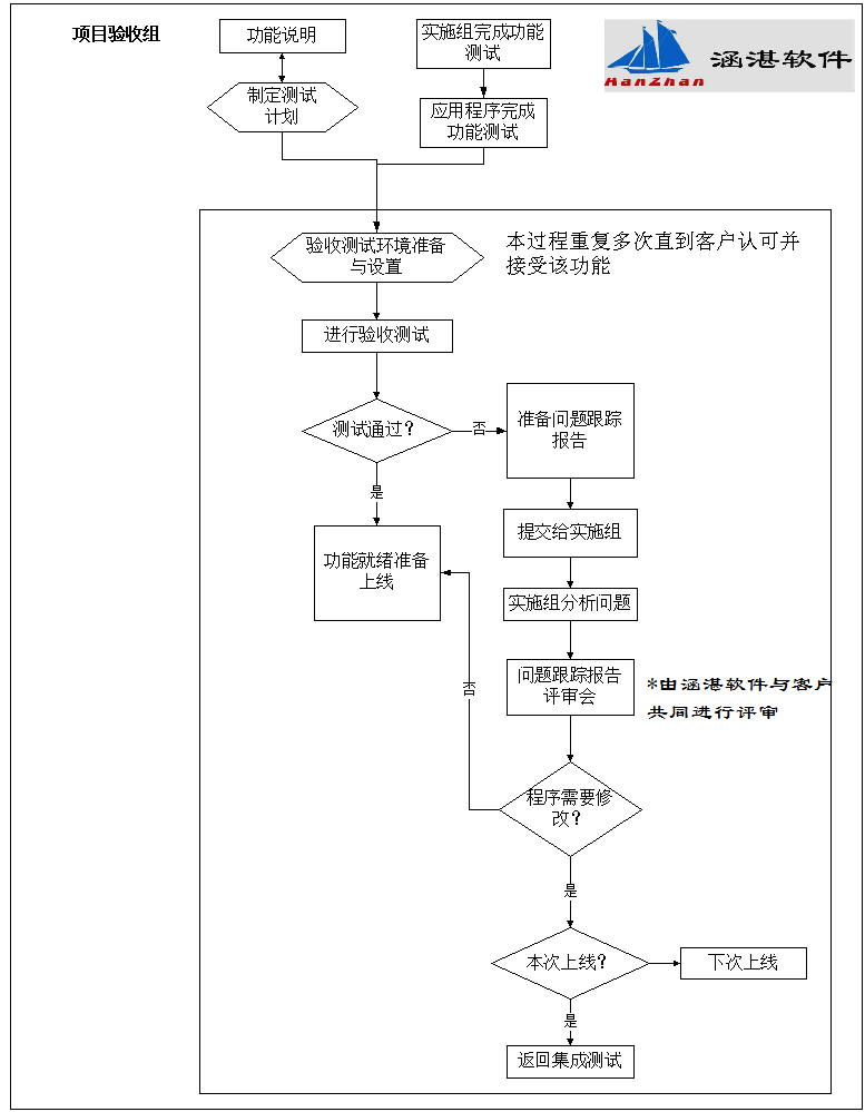 涵湛軟件MES軟件將協助制定用戶驗收測試計劃,準備驗收測試案例 (腳本和數據)以及期望的結果。驗收測試由雙方組成的驗收小組負責執行,MES軟件提交的所有功能都需要經過雙方的驗收測試/功能確認,驗收小組MES軟件建議由各個相關功能的最終用戶組成。