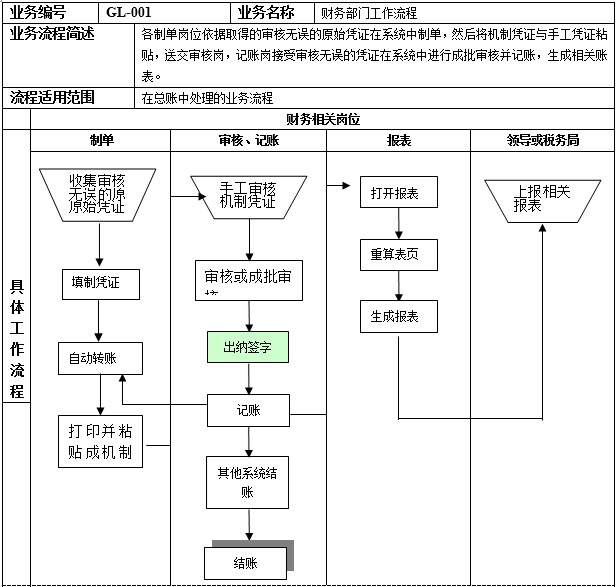 1、 財務部各制單崗位根據收集的原始憑證,按照業務特點有的直接在【總賬】模塊中制單,有的在各功能模塊根據已錄入的審核無誤的業務單據直接生成憑證。某些憑證可進行自定義結轉憑證,如計算本月應交稅金,但相關科目必須先記賬。 2、 將錄入到系統的憑證,打印并與原始單據粘貼轉交審核崗位。 3、 審核崗位對制單崗位傳遞來的憑證進行審核。并在【總賬】模塊中執行成批審核。 4、 出納根據制單崗位傳遞來的憑證進行出納簽字。并在【總賬】模塊執行成批出納簽字。 5、 記賬崗位根據審核崗位轉過來的憑證在系統中執行記賬。 6、 系統記賬完畢之后,各崗位在模塊中生成各自報表。 7、 財務主管確認本月業務均得到處理之后,并確認其他系統結賬后,將【總賬】模塊執行結賬。 注意: 1、 上述流程均可逆向操作。 2、可以查詢包含未記賬憑證的查詢賬簿。 |