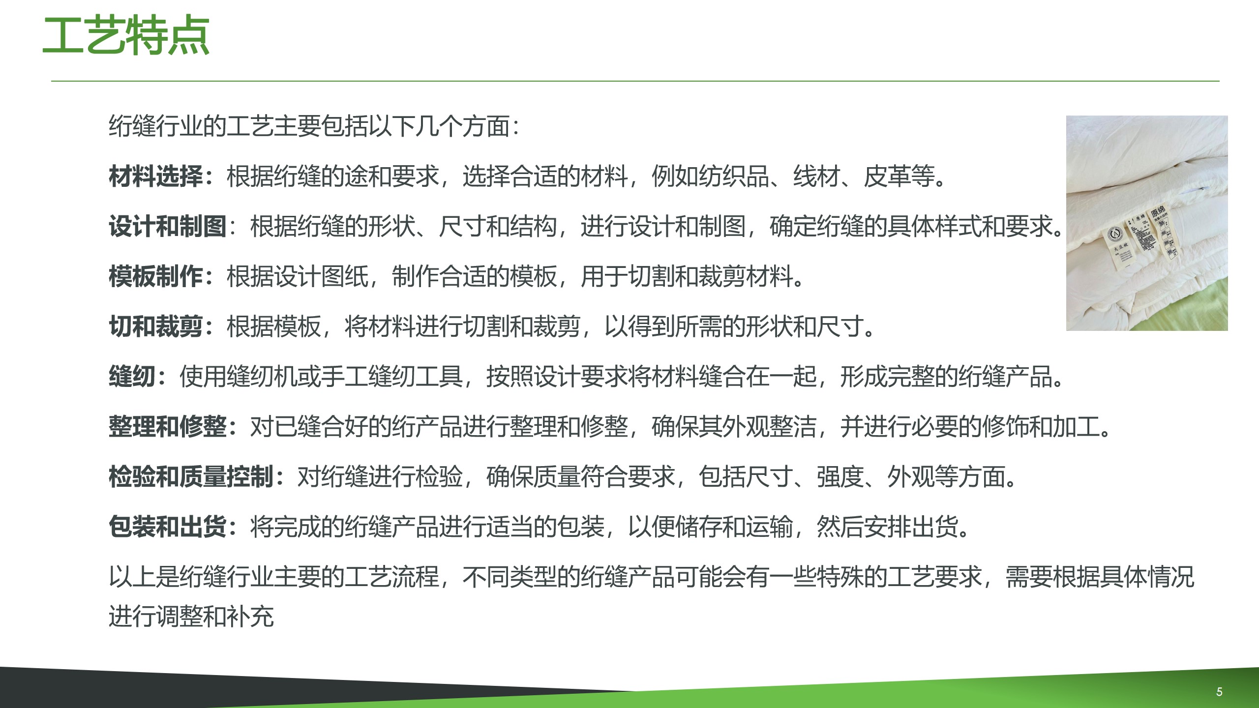 在絎縫行業中,主要生產的產品包括各種類型的面料、紗線、織帶和飾。這些產品被用于生產各種服裝,如襯衫、褲子、裙子、工作制服等等。同時,絎縫行業也用于生產一系列的家庭用品,如窗簾、床上用品、毛巾等等。