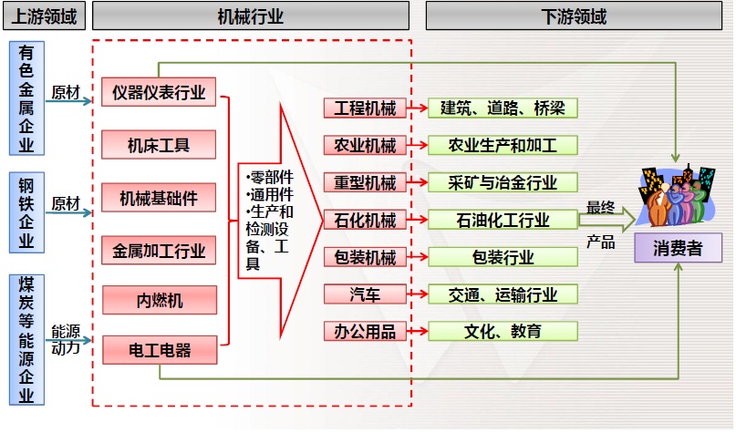 機械行業作為國民經濟的裝備行業,下游行業眾多,幾乎涉及到三大產業的各個方面。同時,上游產業煤、電力等能源瓶頸行業和鋼鐵冶煉等原材料行業構成機械行業的發展瓶頸,對行業發展制約性很大