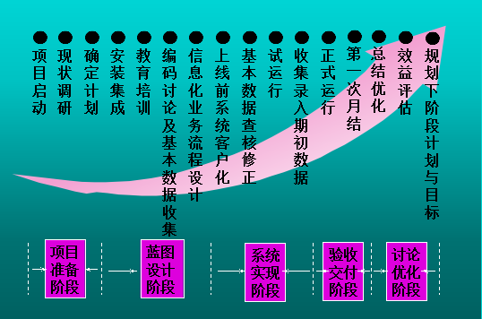 ERP系統實施項目大體可以分為項目準備、培訓、業務藍圖、系統設計、上線準備、上線支持及持續改進等階段,各階段的工作既有側重點,又有交叉。ERP實施過程當中的同步工程式項目管理方法與新產品開發項目的管理在原理和技巧上是類似的。采取同步工程式的項目管理方法,可以在同一時期內同時進行兩項或兩項以上的項目具體工作,從而縮短ERP系統的實施周期。