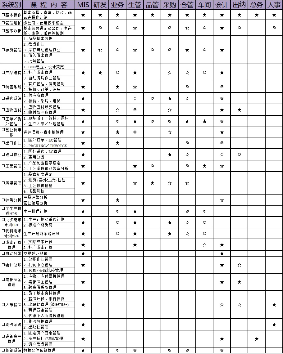 MIS部、研發部、業務部、生管部、品管部、采購部、倉管部、車間部、會計部、出納部、總務部、人事部