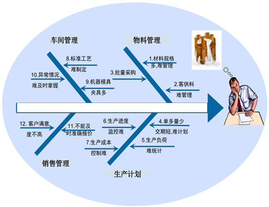 12)接單生產(chǎn)方式難以掌控:常常需要于接單時(shí)確定客戶特殊要求,并根據(jù)訂單單獨(dú)設(shè)計(jì),準(zhǔn)備材料、生產(chǎn)、核算成本。手工作業(yè)時(shí)面對(duì)龐大的材料清單,復(fù)雜的生產(chǎn)狀況等,常常造成交貨延遲,庫(kù)存積壓,加工失誤等等問題;