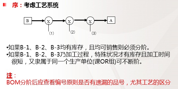 如生產出的半成品不需入庫,而是直接轉到下一道工序/車間,則不建議將此BOM單獨分層;如生產出的半成品,需要入半成品倉之后,下一道工序/車間生產時,又從半成品倉領出,則BOM在此處應考慮分層。