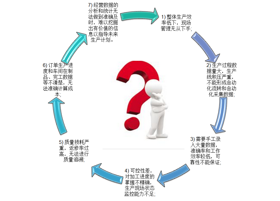 4) 可控性差,對加工進度的掌握不精確,生產(chǎn)現(xiàn)場狀態(tài)監(jiān)控能力不足;